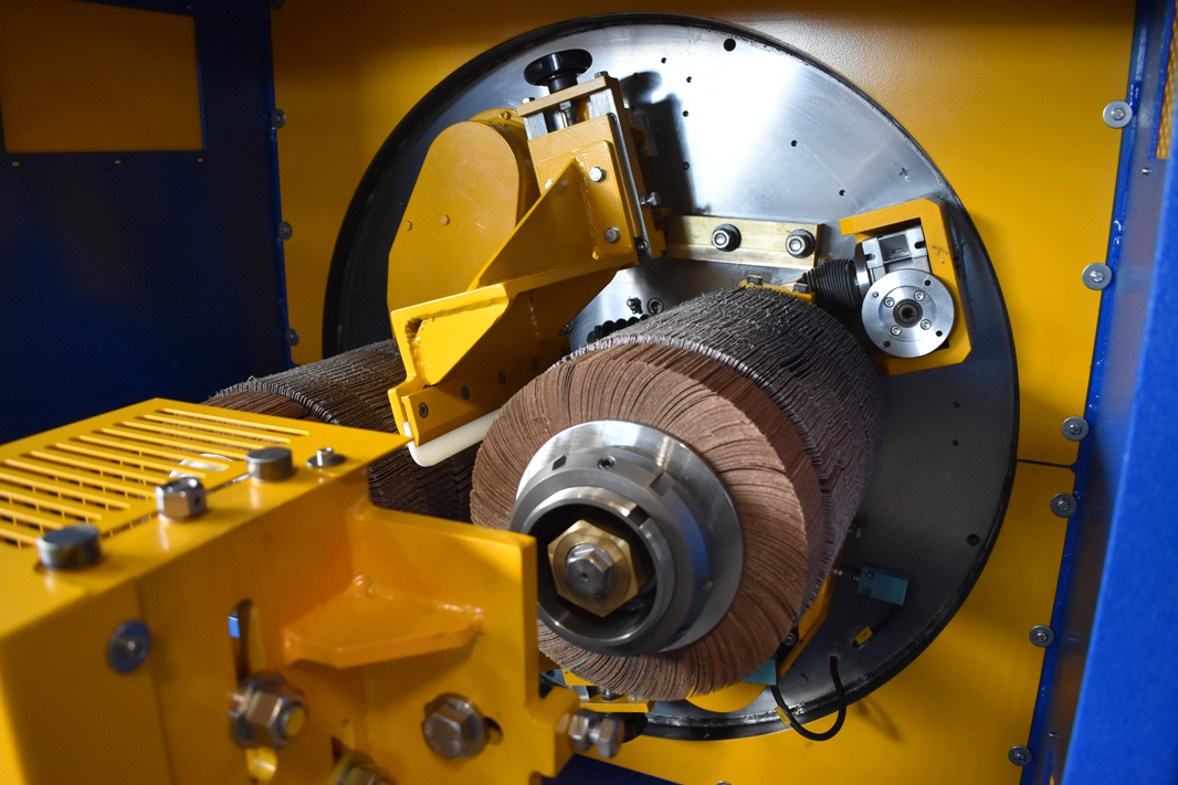Anche le macchine della serie SP sono dotate di due spazzole di grandi dimensioni (ruote lamellari oppure Scotch-Brite o Tynex), con velocità periferica regolabile tramite inverter, diametro del tamburo contenuto nella misura idonea ad accogliere tutti i cinematismi, inverter per regolazione giri tamburo, lavorazione a secco, gestione elettronica tramite PLC S7.